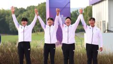 한국 골프 남자 대표팀 장유빈(왼쪽부터), 조우영 임성재, 김시유가 1일 중국 항저우 서호 국제 골프코스에서 열린 2022 항- 2023-10-01 16:59