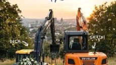 도심이 내려다보이는 언덕 위, 면사포와 나비넥타이를 단 굴착기 두 대가 나란히 서 있다. 그 위로 '우리 결혼했어요'라는 문구- 2026-02-18 08:00