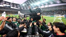 [포토]전북 선수들의 헹가래 받는 타노스 코치