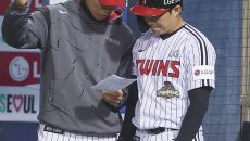 [ST포토] 오지환, 모창민 코치와 다음타선 준비