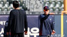 16일 잠실구장에서 열린 LG와 롯데의 경기. 롯데 유강남과 LG 이재원이 인사를 나누고 있다. 잠실=박재만 기자 pjm@sp- 2026-04-16 16:18