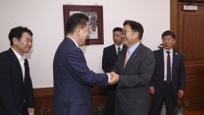 더불어민주당 김병기 당대표 직무대행 겸 원내대표가 16일 오전 서울 여의도 국회 의장실을 예방해 우원식 국회의장과 악수를 하고- 2025-06-16 11:28