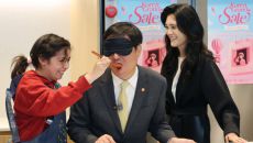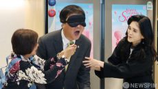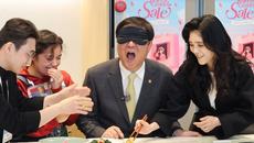 안대 쓰고 음식 시식하는 최휘영 문화체육관광부 장관