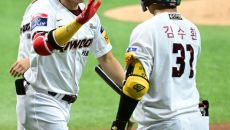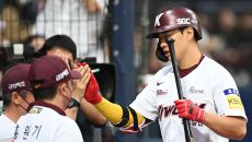 [사진]송성문, '0의 균형 깬 선제 솔로포 하이파이브'