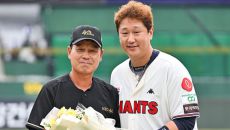 [사진] 이대호 축하 받는 KBO 40주년 레전드 전준호 코치