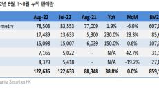 유안타증권에 따르면 길리자동차의 2022년 8월 인도대수는 12만2600대로 전년 대비 39% 급증했다. 1~8월 누적 인도대- 2022-09-11 09:00