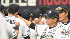 [사진]김태형 감독,'동점포 양석환 향한 애정의 펀치'