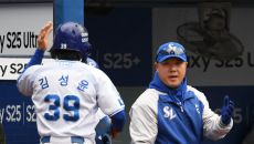 5일 대구 삼성라이온즈파크에서 열린 삼성 라이온즈와 한화 이글스의 경기. 3회말 역전 득점을 올린 삼성 김성윤을 박진만 감독이- 2025-04-05 16:15