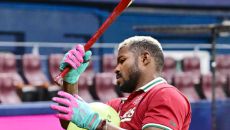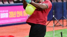 [사진]푸이그,'가슴 사이에 짐볼을 끼고 타격 연습'