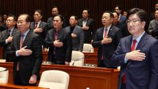 국기에 경례하는 국민의힘. 국민의힘 권영세 비상대책위원장과 권성동 원내대표 등 의원들이 윤석열 대통령 탄핵 인용이 발표된 4일- 2025-04-05 14:09