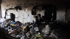 가자지구 북부 자발리아 난민촌에서 2일(현지시간) 팔레스타인 아이들이 총탄 자국이 선명한 폐허 속에서 몸을 숨기고 있다. 이날- 2025-04-05 14:12