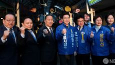 [서울=뉴스핌] 이건주 인턴기자 = 정원오 서울시장 예비후보가 12일 오후 서울 남부골목시장에서 더불어민주당 지역구 예비후보들- 2026-03-12 19:16