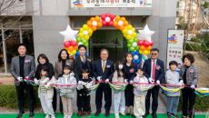 부산시교육청이 연제구 더샵파크시티 아파트 단지 내 작은도서관에서 '우리 동네 자람터' 개소식을 열고 참석자들과 기념 촬영을 하- 2026-03-12 17:50