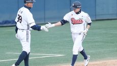 [ST포토] 정수빈, 고토 코치와 하이파이브