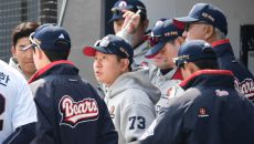 12일 이천 두산베어스파크에서 열린 KBO리그 시범경기 두산과 키움의 경기. 선수들과 미팅 갖는 두산 손시헌 코치. 이천=송정- 2026-03-12 14:42