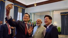 李·모디·이재용 '갤럭시폰' 보며 활짝…화기애애 셀카