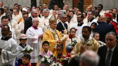 레오 14세(가운데) 교황이 24일(현지시간) 바티칸 성베드로대성당에서 성탄 전야 미사를 주재하던 중 미사 말미에 아기 예수상- 2025-12-26 01:19