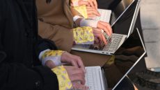추위 속 국회 본청 앞 야외에서 손등에 핫팩을 붙이고 기자들이 나란히 앉아 노트북으로 기사를 작성하고 있습니다. 어떤 극한 환- 2025-12-26 02:42