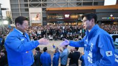 이재명 더불어민주당 대선 후보와 김경수 총괄선대위원장이 13일 울산 남구 롯데백화점 광장에서 진행된 집중유세에서 만나 인사하고- 2025-05-13 21:15