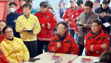 22일 충남 예산군 대술면 산불 발생 현장 인근에 설치된 산불현장통합지휘본부에서 김태흠 지사가 진화 상황을 듣고 있다/[사진=- 4시간전