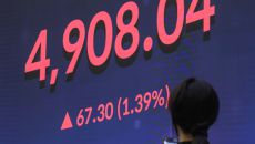코스피가 장중 4900선을 넘어선 가운데 19일 오후 서울 여의도 한국거래소 홍보관 전광판에 코스피 종가 4908.04 포인트- 2시간전
