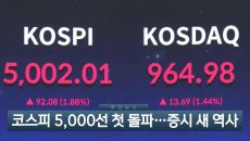 ■코스피 5,000선 첫 돌파…증시 새 역사■ 오늘 코스피가 개장과 동시에 5,000선을 돌파하며, 우리 증시의 새 역사를 세- 2시간전