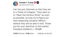 도널드 트럼프 미국 대통령이 현지시간 28일 "이란이 우리에게 본인들이 '붕괴 상태'에 처해 있다고 알려왔다"고 밝혔습니다.- 15시간전