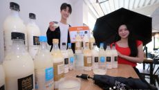 17일 서울 서초구 느린마을양조장 양재본점에서 모델들이 막걸리와 우산을 펼쳐보이고 있다. 홈술닷컴은 7월 20일까지 '장마에는- 2025-06-17 12:13