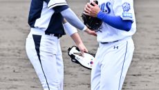 20일 일본 오키나와 온나손 아카마 구장에서 열린 대한민국 야구 대표팀과 삼성 라이온즈의 평가전, 삼성 배찬승이 마운드에서 내- 1시간전