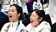 8일 이탈리아 밀라노 아이스스케이팅 아레나에서 열린 피겨 팀이벤트 남자싱글. 차준환 응원하는 임해나, 이해인. 밀라노(이탈리아- 2026-02-08 05:00