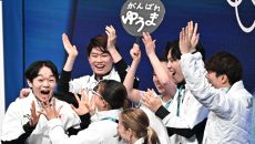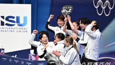 8일 이탈리아 밀라노 아이스스케이팅 아레나에서 열린 피겨 팀이벤트 남자싱글. 점수를 확인하고 동료들과 함께 기뻐하는 일본 가기- 2026-02-08 05:31
