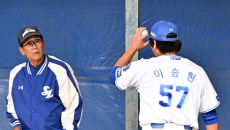 20일 일본 오키나와 온나손 아카마 구장에서 열린 대한민국 야구 대표팀과 삼성 라이온즈의 평가전, 최일언 코치가 이승현을 지도- 7시간전