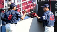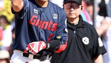 26일 광주KIA챔피언스필드에서 열린 롯데와 KIA의 경기. 5회말 투구를 무실점으로 마친 나균안이 야수진을 맞이하고 있다.- 2시간전