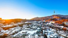 눈 덮인 한옥마을의 일출