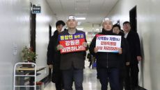 김진태 강원특별자치도지사가 지난 9일부터 10일까지 국회 행정안전위원회 제1법안심사소위원회 회의실 앞에서 '투쟁'이라고 적힌- 2026-02-10 13:22
