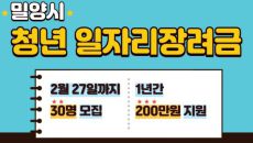 경남 밀양시는 취업 초기 청년들의 안정적인 지역 정착을 지원하기 위해 오는 27일까지 '2026년 청년 일자리 장려금' 지원- 2026-02-10 12:33