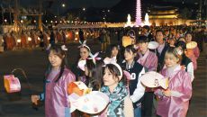 22일 서울 종로구 광화문 광장에서 열린 봉축 점등식에서 참석자들이 연등을 들고 있는 모습. 봉축 점등식은 부처님 오신 날(음- 8시간전