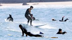 24일 오후 부산 해운대구 송정해수욕장에서 시민들이 서핑을 즐기고 있다. 이날 전국이 대체로 맑은 가운데 낮 기온이 뛰어 초여- 2026-04-25 00:48
