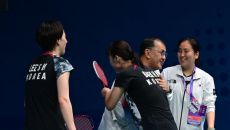 [사진]배드민턴 이소희-백하나, '단체 결승 승리에 김학균 감독과 포옹하며'