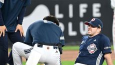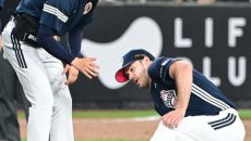 [사진]잭로그,'문현빈의 강습타구에 발목 고통'