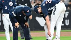 [사진]잭로그,'문현빈의 강습타구에 교체'