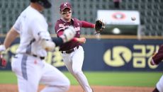[사진]전현우, '애매한 위치 타구를 빠르게 송구'