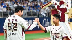 [사진]박병호,'아들과 시구 시타 마치고 하이파이브'