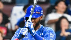 [사진]디아즈,'플라이 타구 친 후 배트로 자기 헬멧 때리며 자책'