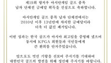 [헤럴드경제 스포츠팀] 한국프로골프협회 구자철 회장이 항저우 아시안게임 남자 골프 단체전에서 금메달을 획득한 대표팀에게 축전을- 2023-10-01 16:32