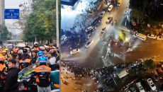 배달원들이 오토바이 경적을 울리며 아파트 단지 앞을 빙글빙글 돌고 있습니다. 곧이어 몰려든 수백 명의 배달원이 경비원들을 향해- 1시간전