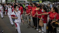 ▲ 중국의 고등학교 교사들이 대입 시험을 치르러 가는 하생들을 격려하고 있다. 중국이 지난 2021∼2024년 대학 교육에 매- 17분전