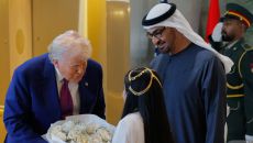 (아부다비 로이터=뉴스1) 류정민 특파원 = 도널드 트럼프 미국 대통령이 15일(현지시간) 아랍에미리트(UAE) 아부다비의 아- 2025-05-15 22:59