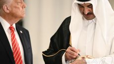 (도하 AFP=뉴스1) 우동명 기자 = 도널드 트럼프 미국 대통령이 14일(현지시간) 도하 왕궁에서 셰이크 타밈 빈 하마드 알- 2025-05-15 11:29