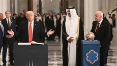 (도하 AFP=뉴스1) 우동명 기자 = 도널드 트럼프 미국 대통령이 14일(현지시간) 도하 루사일 궁전에서 열린 국빈 만찬에- 2025-05-15 11:28